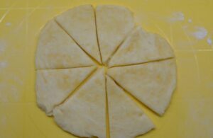 Din aluatul pregatit in forma de clatite, decupati triunghiuri (câteva bucati) si rulati-le in forma de cornuri (puteti pune umplutură cu ciocolata, dulceata, nuca, etc).