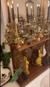 Sunt bibelouri colorate, precum și tablouri cu rame opulente. Draperiile grele completează atmosfera sofisticată. Masa lungă este întinsă și încărcată cu delicatese, reprezentând un adevărat ospăț regal.