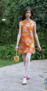 Rochia pe care o poartă este sofisticată, de culoare portocalie, împodobită cu mărgele la baza gâtului.