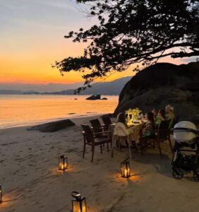 Cu ajutorul tatălui lor, fetițele au organizat o surpriză specială pentru sărbătorită: o cină romantică pe malul oceanului, cu o atmosferă de vis, decorată cu felinare.