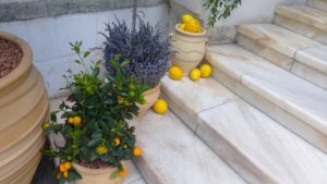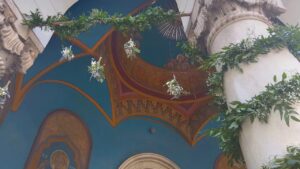 Cei doi au optat pentru o tematică inspirată din cultura grecească, astfel că pe scările bisericii au fost amplasate lămâi, crenguțe de măslin și lavandă, formând un cadru natural deosebit.