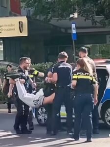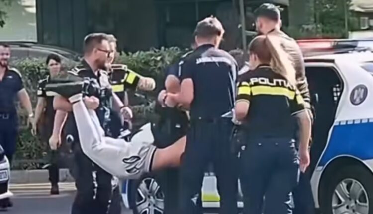 Din materialele video reiese că bărbatul a fost ridicat de forțele de ordine, fiind prins de mâini și de picioare, apoi a fost așezat pe bancheta din spate a unei autospeciale de poliție și dus la un centru destinat tratării persoanelor cu ieșiri violente.