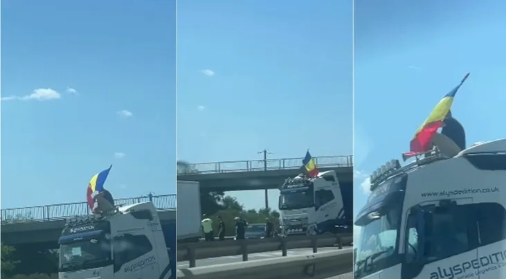 Circulația pe autostrada A1, direcția către București, a fost complet paralizată duminică după-amiază, după ce un conducător auto a oprit un camion de mare tonaj de-a curmezișul drumului și s-a urcat pe cabină, unde a început să fluture un steag tricolor.