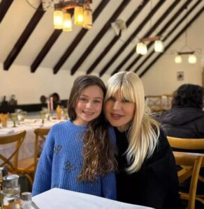 A doua fotografie are o atmosferă mult mai personală și plină de căldură. Elena Udrea apare alături de fiica sa, Eva Maria, într-un spațiu interior, probabil un local amenajat festiv. Cele două sunt surprinse apropiate, zâmbitoare, într-un cadru care inspiră calm și afecțiune. Elena Udrea poartă o ținută elegantă, iar Eva Maria este îmbrăcată într-un pulover albastru, potrivit vârstei, conturând imaginea unei seri liniștite petrecute în familie.