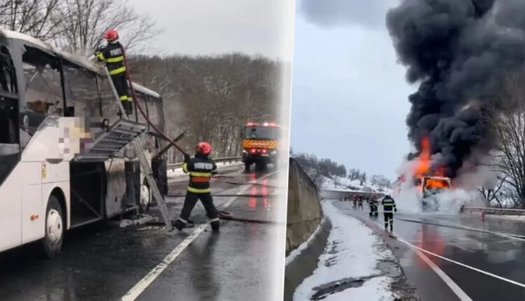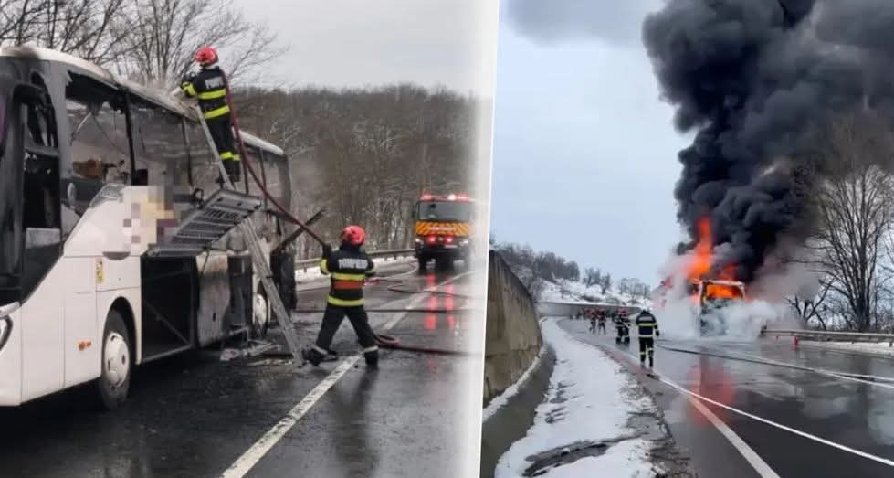 Un autocar in care se aflau 47 de oameni a luat foc în județul Mureș