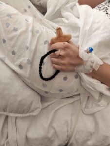 Mâna surprinsă în imagine, purtând semnele tratamentelor medicale, strânge o metanie și o cruce. Pentru cei care o cunosc, acest gest este expresia modului în care doamna preoteasă a ales să își înfrunte încercările: prin rugăciune și credință.