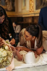 În imaginile din biserică, Theo Rose este vizibil emoționată, ținându-și fina în brațe, în timp ce Anghel Damian îi este alături cu discreție. Zâmbetele și micile gesturi transmit o legătură sinceră, departe de rigiditatea evenimentelor mondene.
